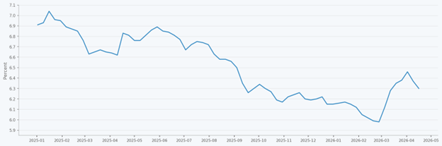 ריבית המשכנתא הממוצעת ל-30 שנה, שהגיעה לשיא של 7.79% באוקטובר 2023, והיתה במגמת ירידה עד אוקטובר 2024 (אז עמדה על 6.08%) – עלתה במהלך הרבעון מ-6.18% בתחילתו ל-6.38% בסופו (מרץ 2026), ובתחילת אפריל אף ל-6.46% – השיא של שבעה חודשים. העלייה מגיעה על רקע המלחמה באיראן ועליית תשואות האג"ח הממשלתיות.