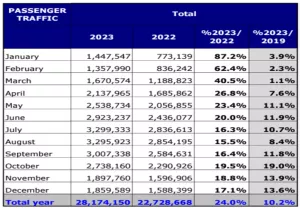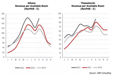 הנתונים המלאים של שנת 2023 עדיין לא התפרסמו, אולם נכון לחודש נובמבר נכנסו ליוון יותר מ-33 מיליון תיירים, מה שכנראה מעיד על שנת שיא. כל נתוני הסקטור מראים על עלייה, כולל ADR, תפוסה, והוצאה ממוצעת לאורח. אתונה במיוחד הציגה גידול בביקושים. ניתן לראות זאת בגרף המצורף של GBR ובנתוני הכניסה של שדה התעופה הבינלאומי שבעיר שמראים עלייה שנתית של 24% במספר הנוסעים.